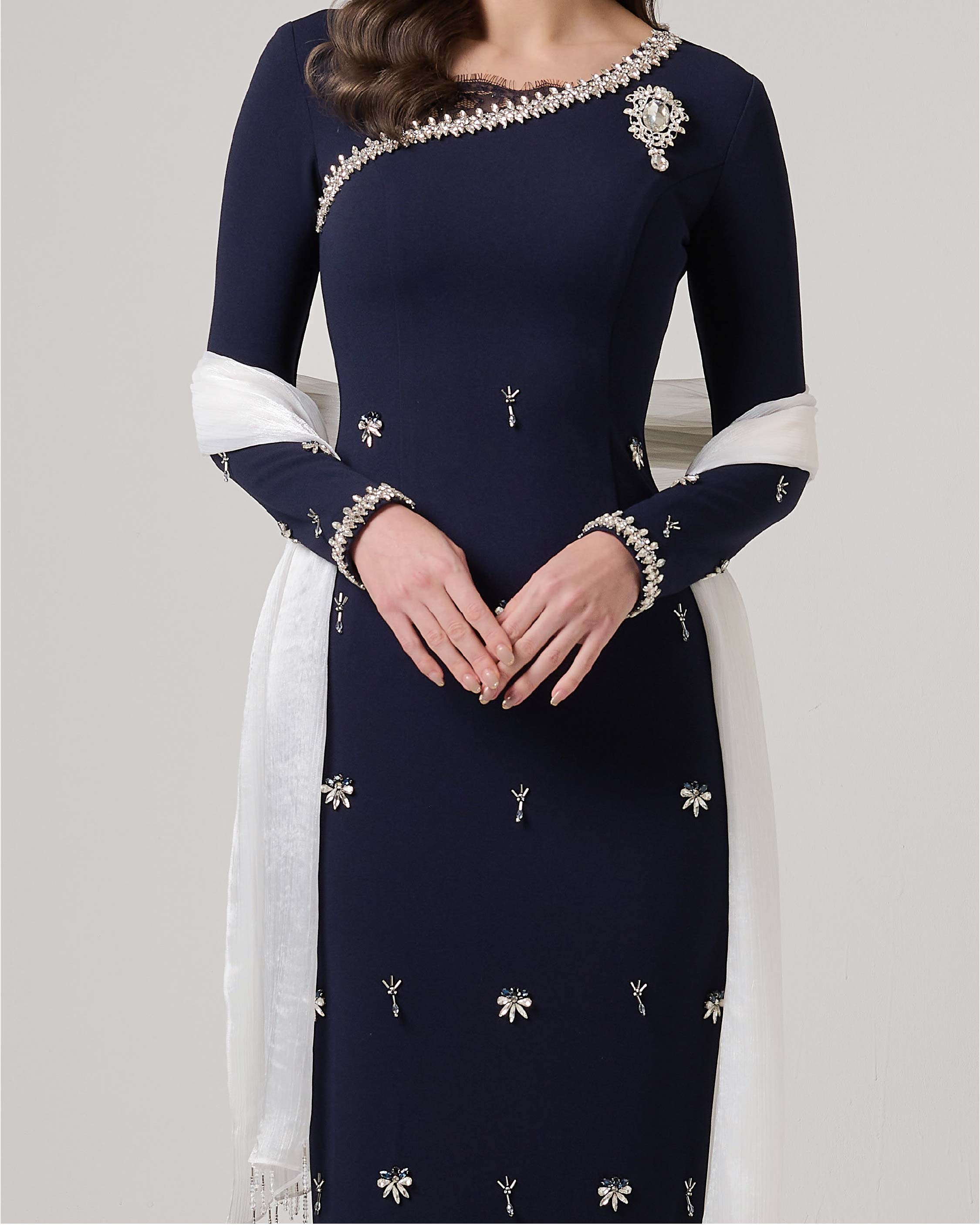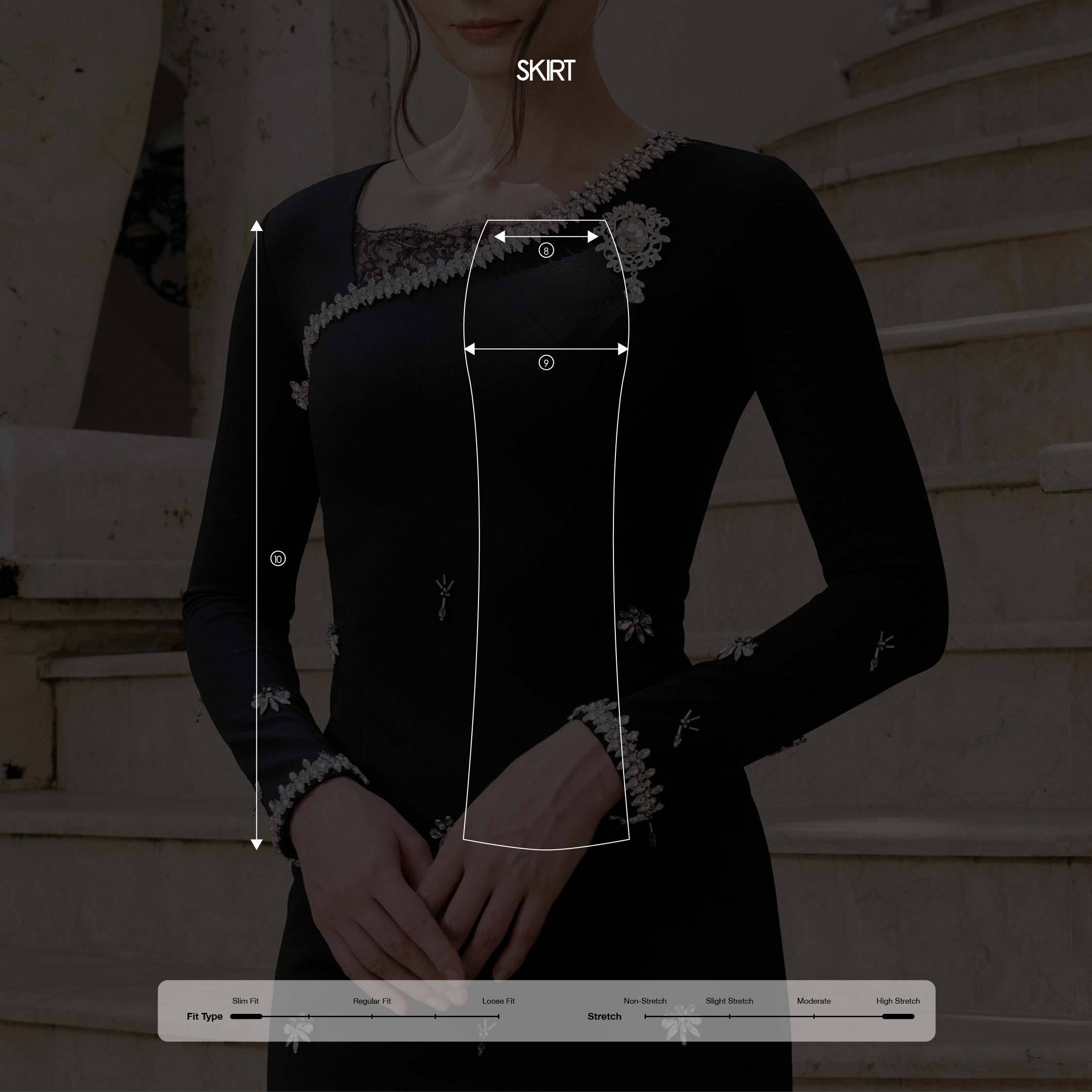 - Assymetrical neckline embellished with exclusive diamond beads and french lace
