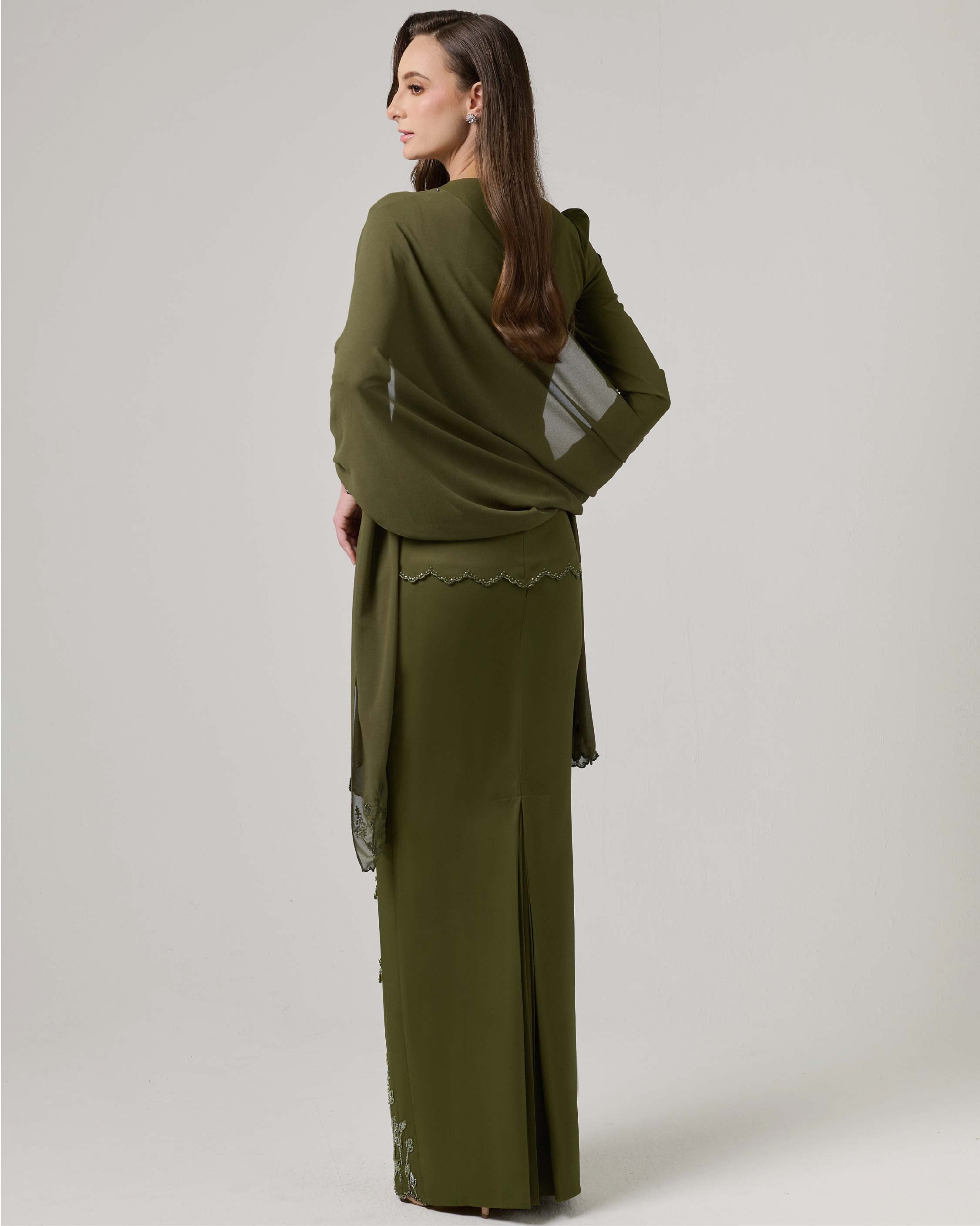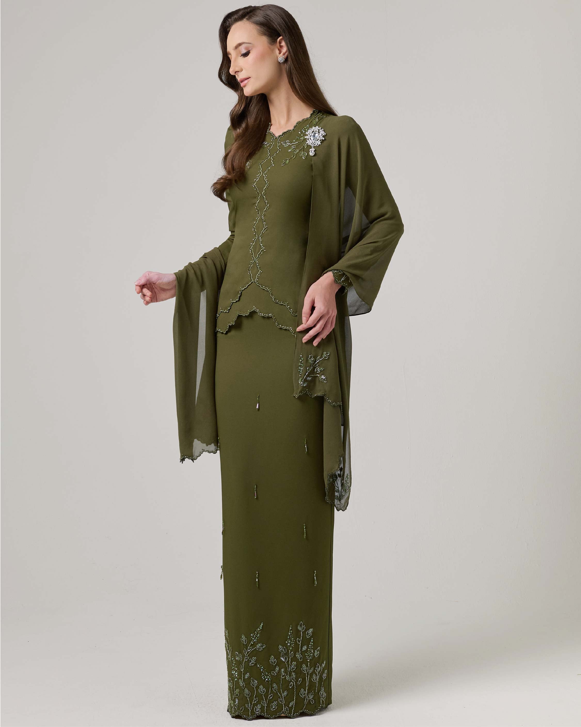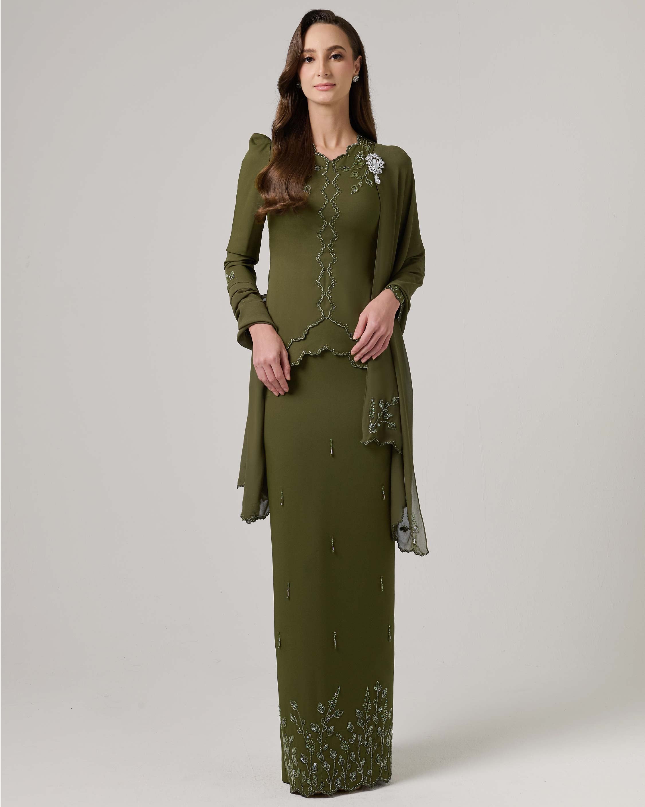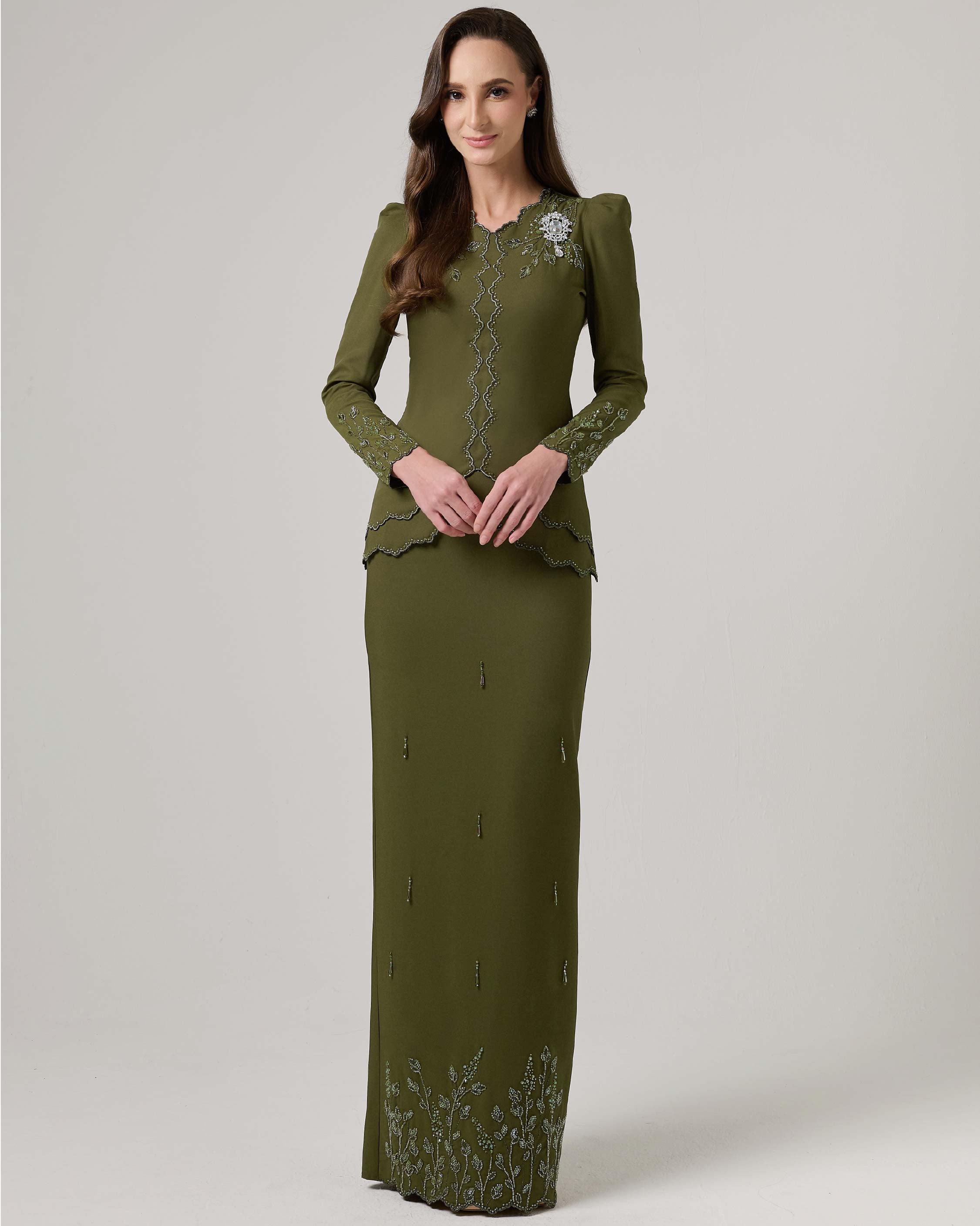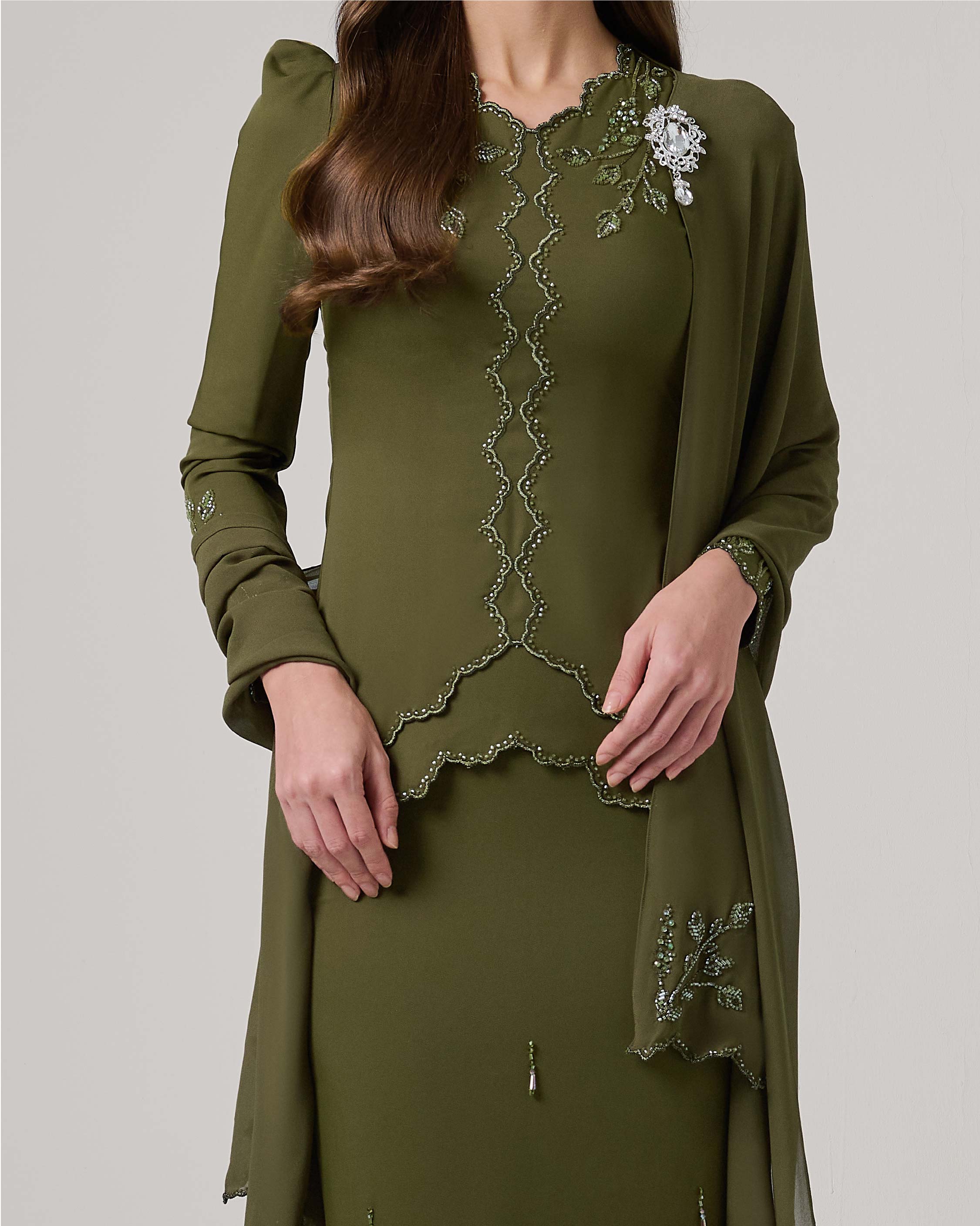 - Scallop with beaded embroidery at center kurung for subtle kebaya look