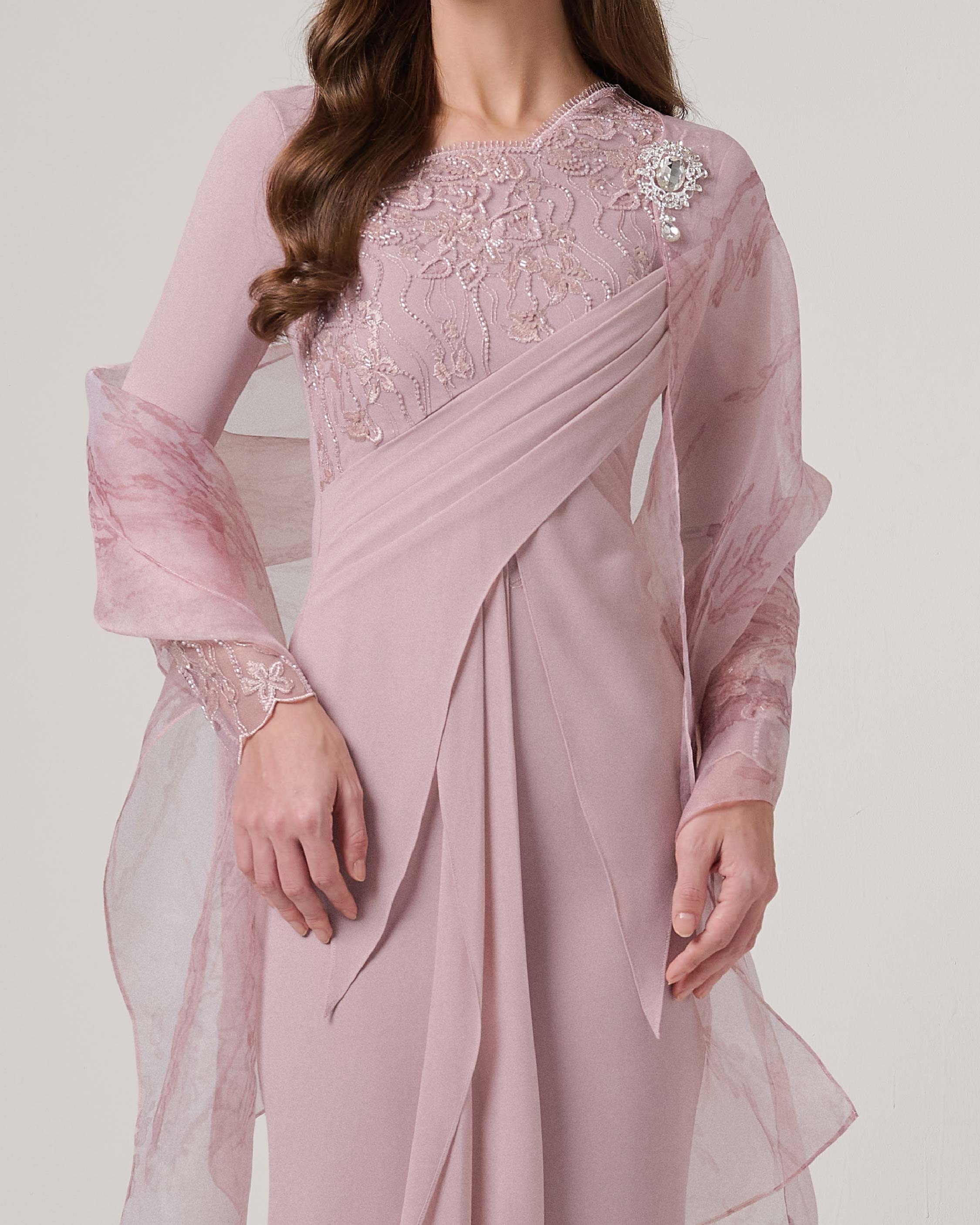 - Fitted sleeves with subtle beaded lace embellishment
