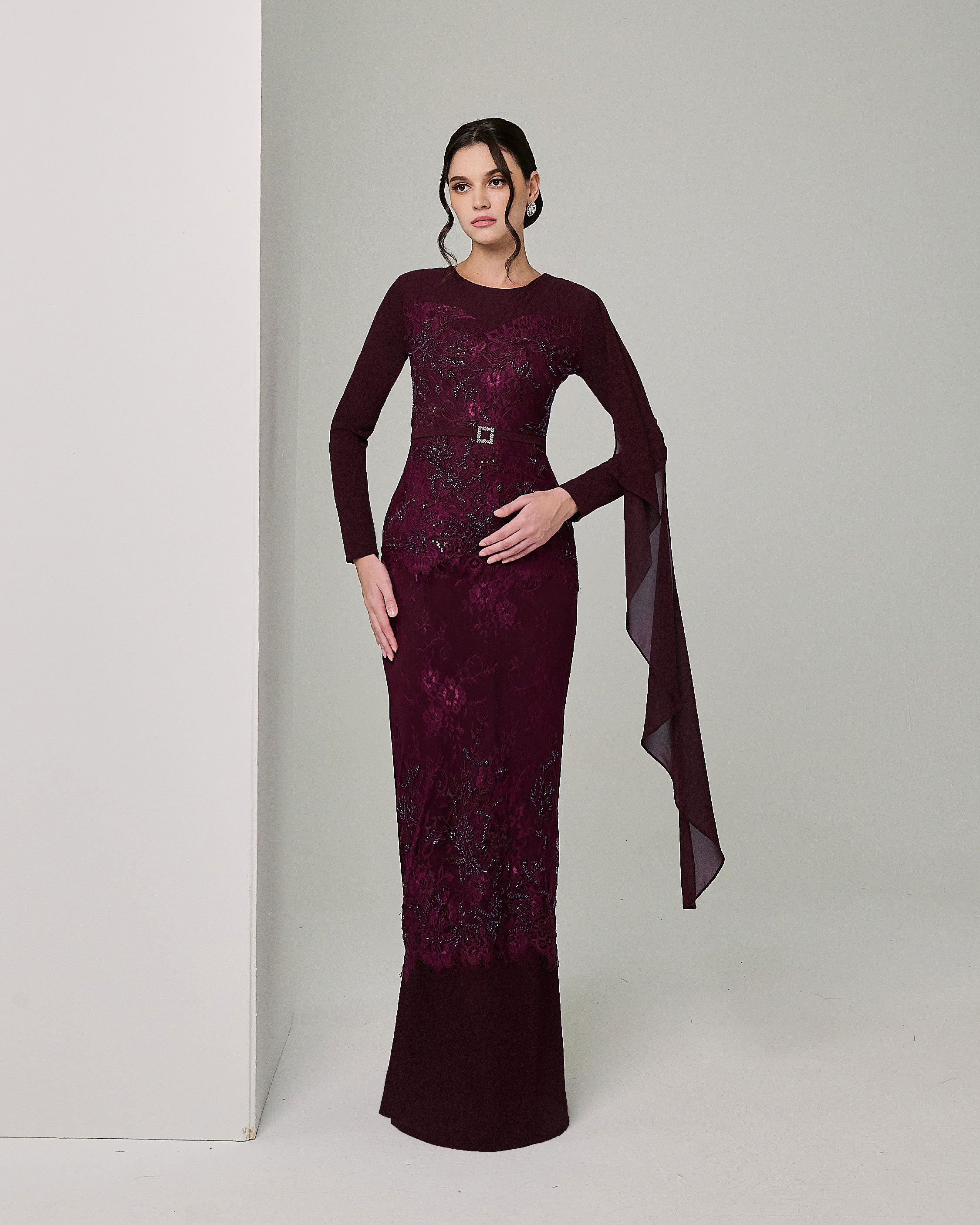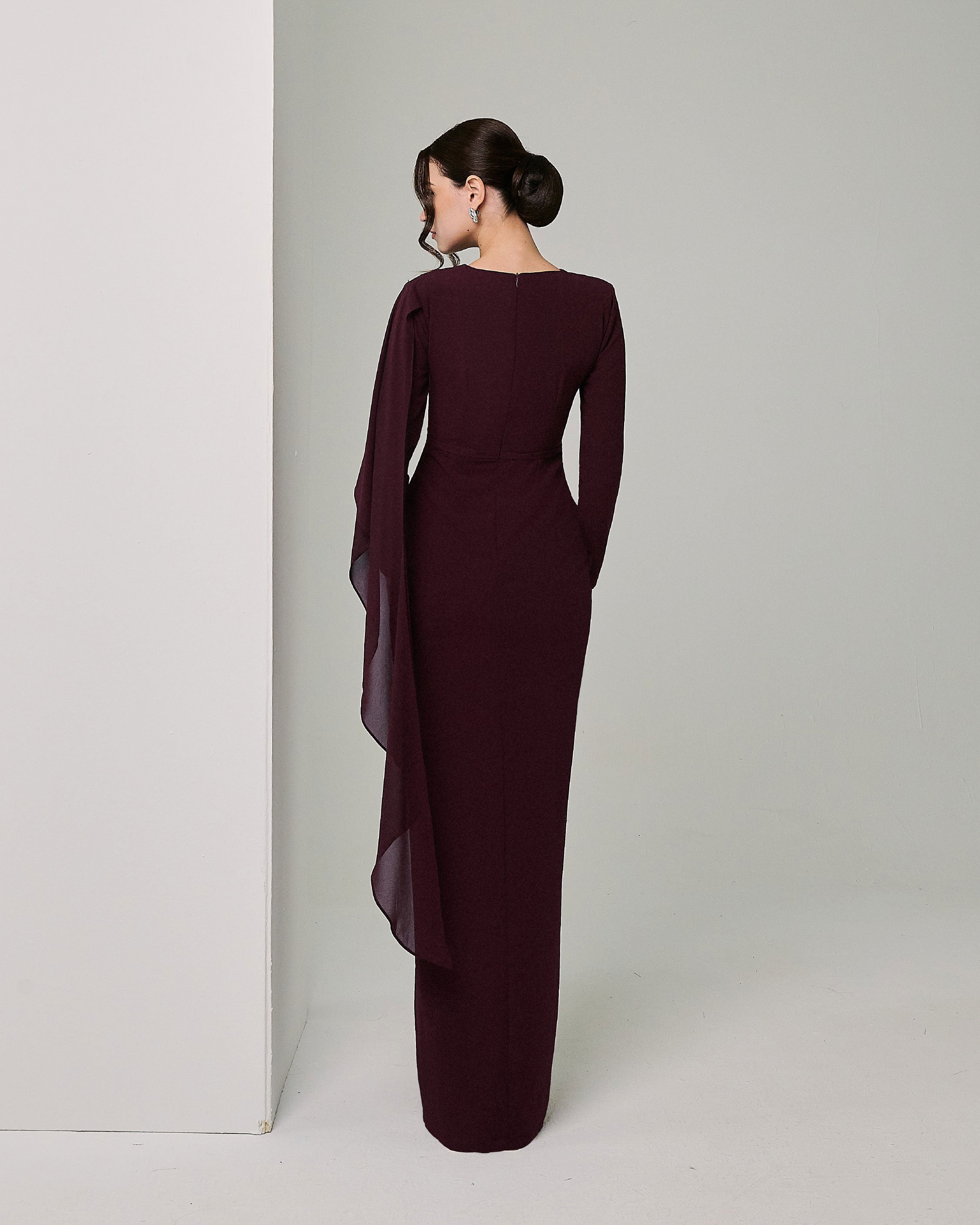 - Minimal draping at shoulder with exquisite flare at the sleeve