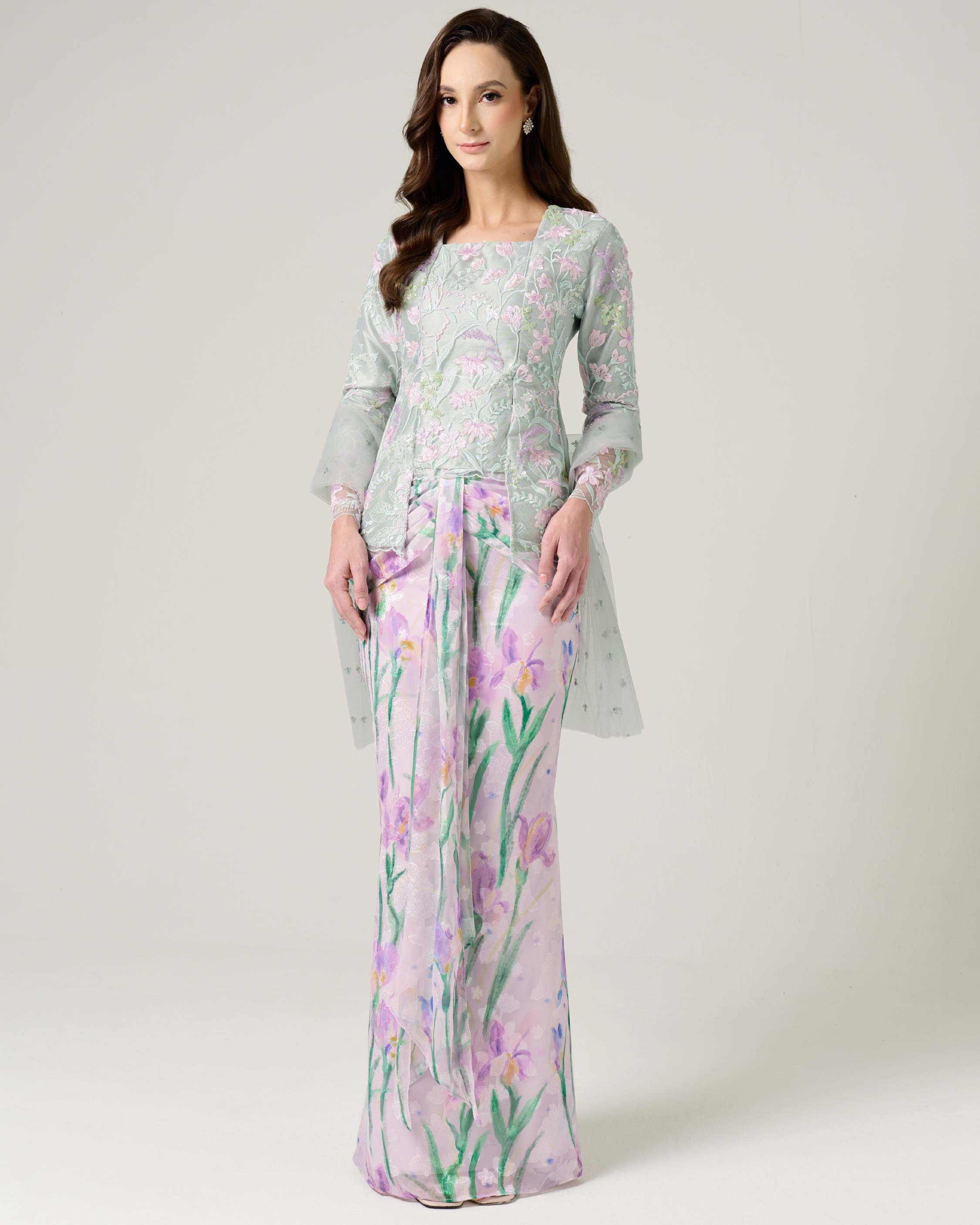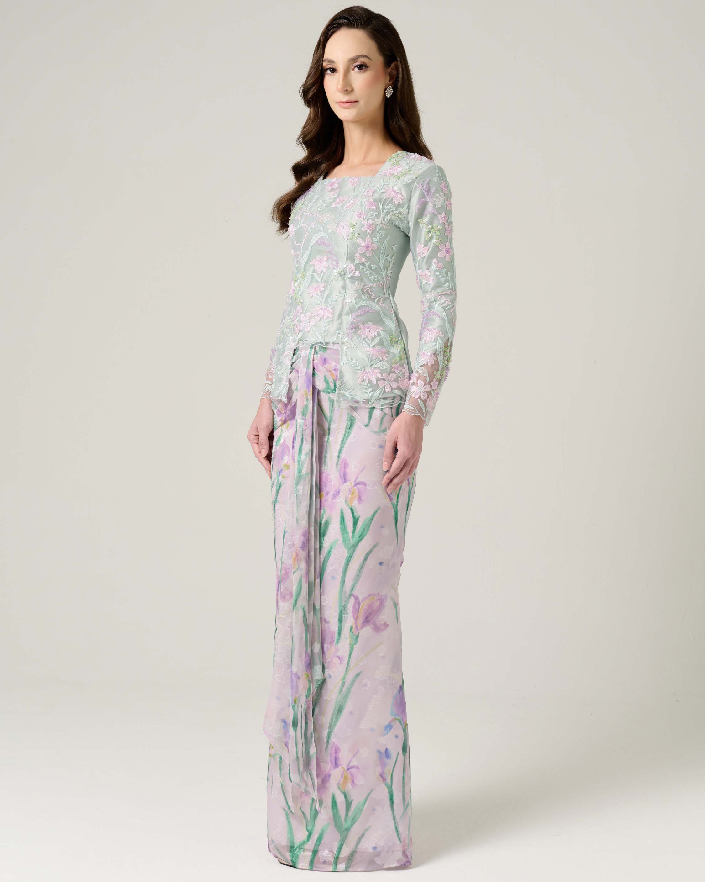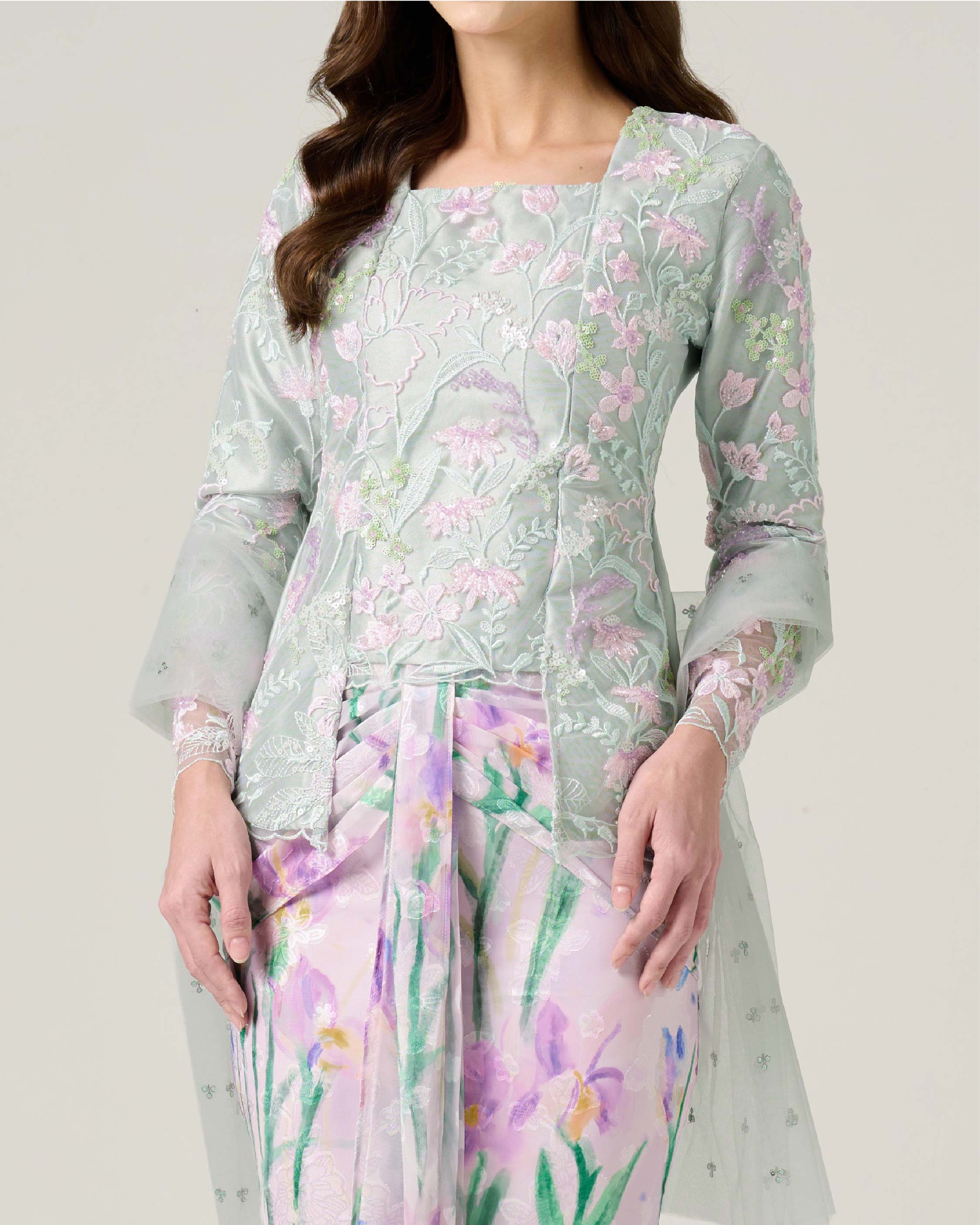 - Fully embroidered floral beaded lace on top