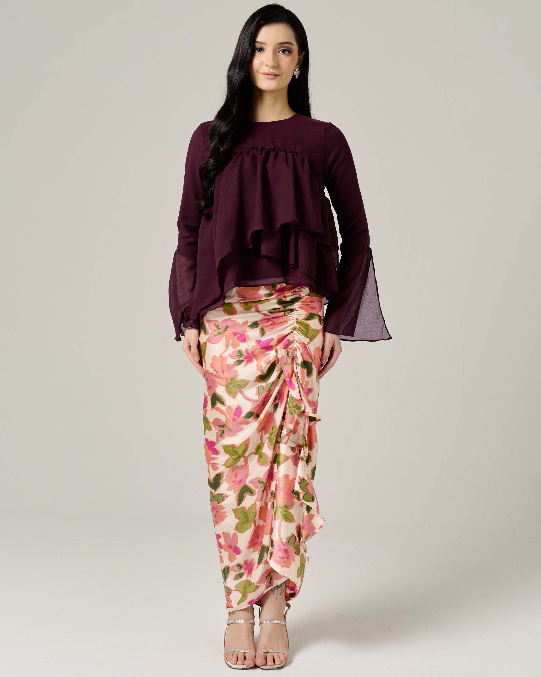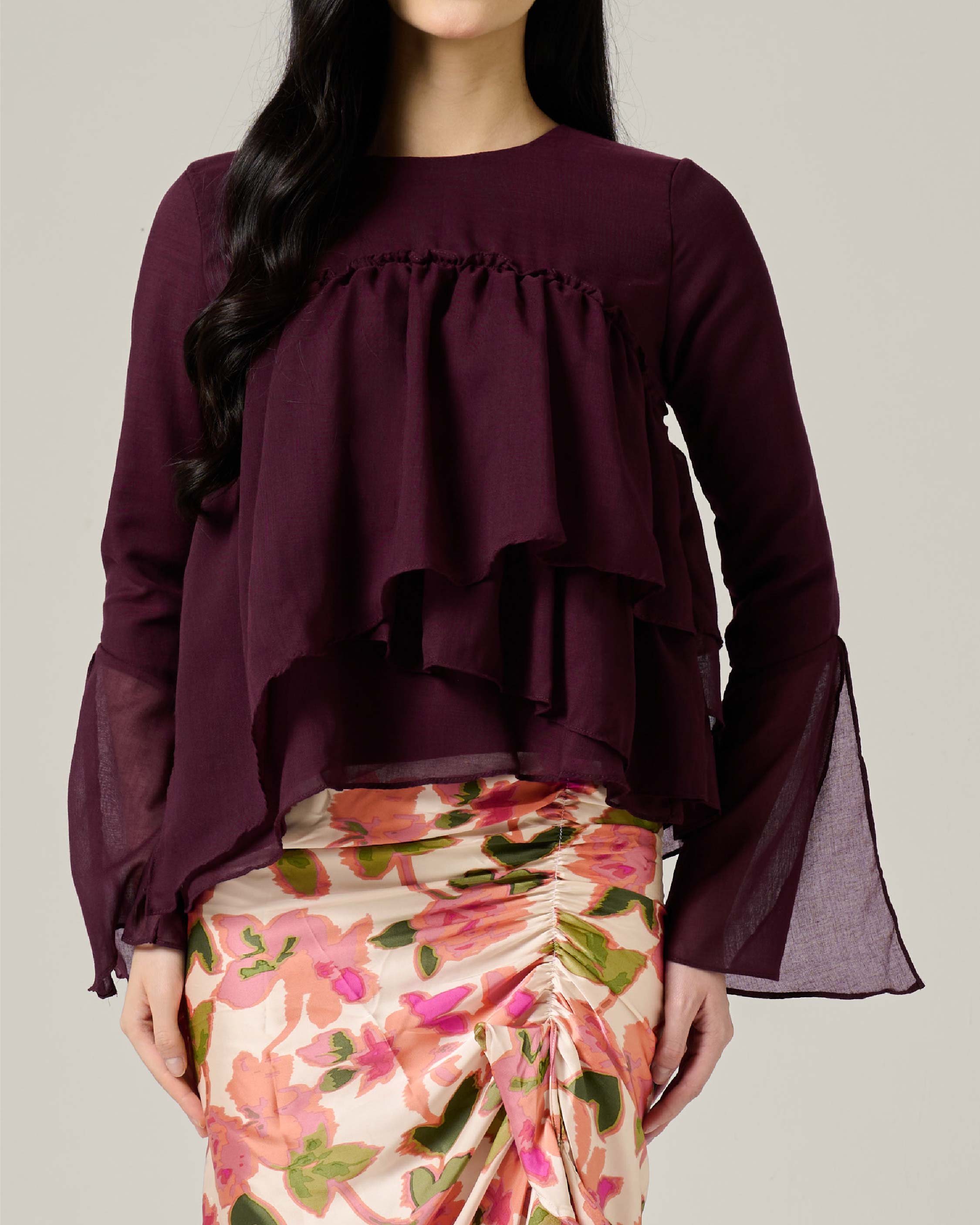 - Layered gathered design for the top for a soft, dimensional look