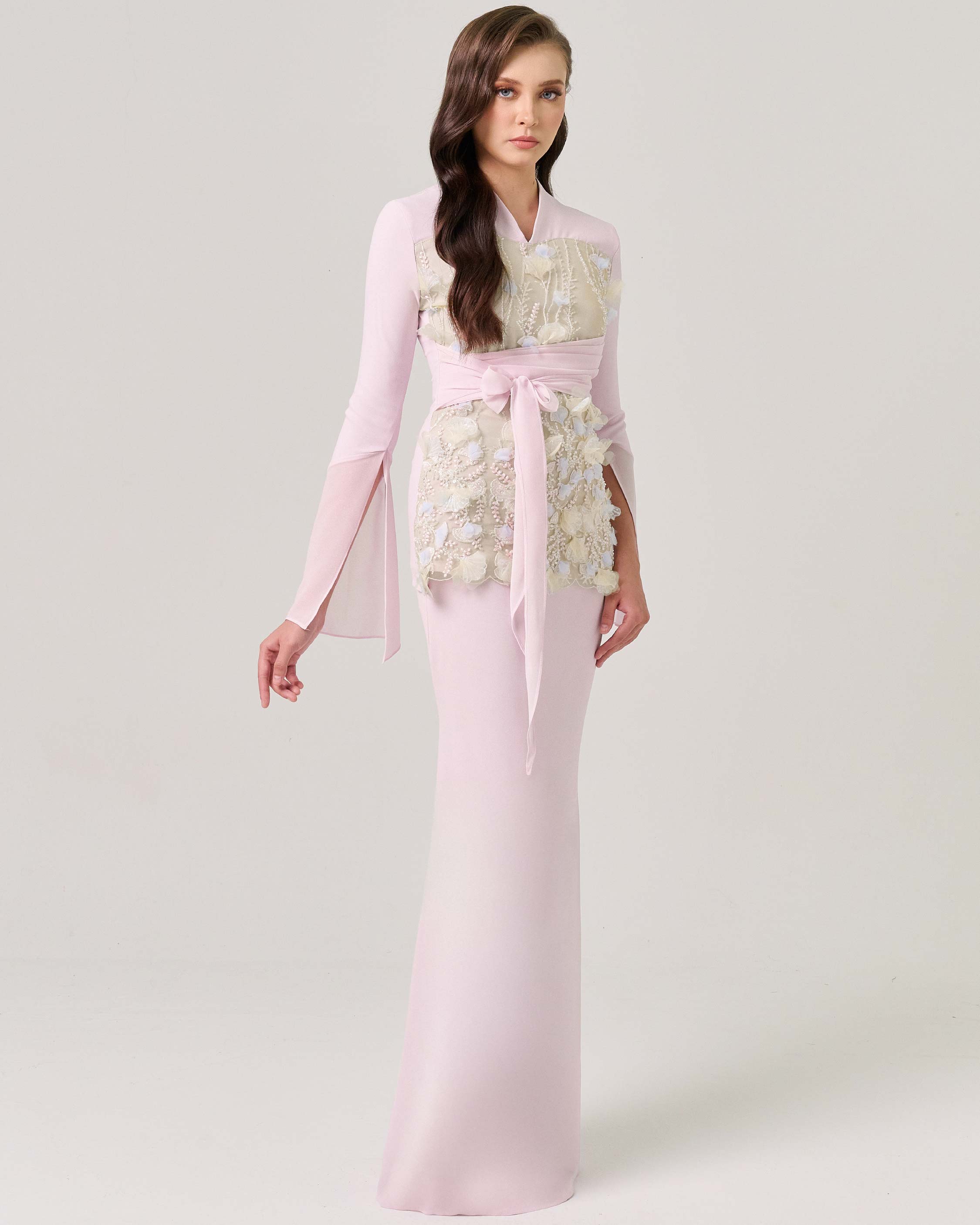 This design features lace with delicately placed bead embellishments. Please note that beading is applied selectively, and not all areas of the lace are fully beaded