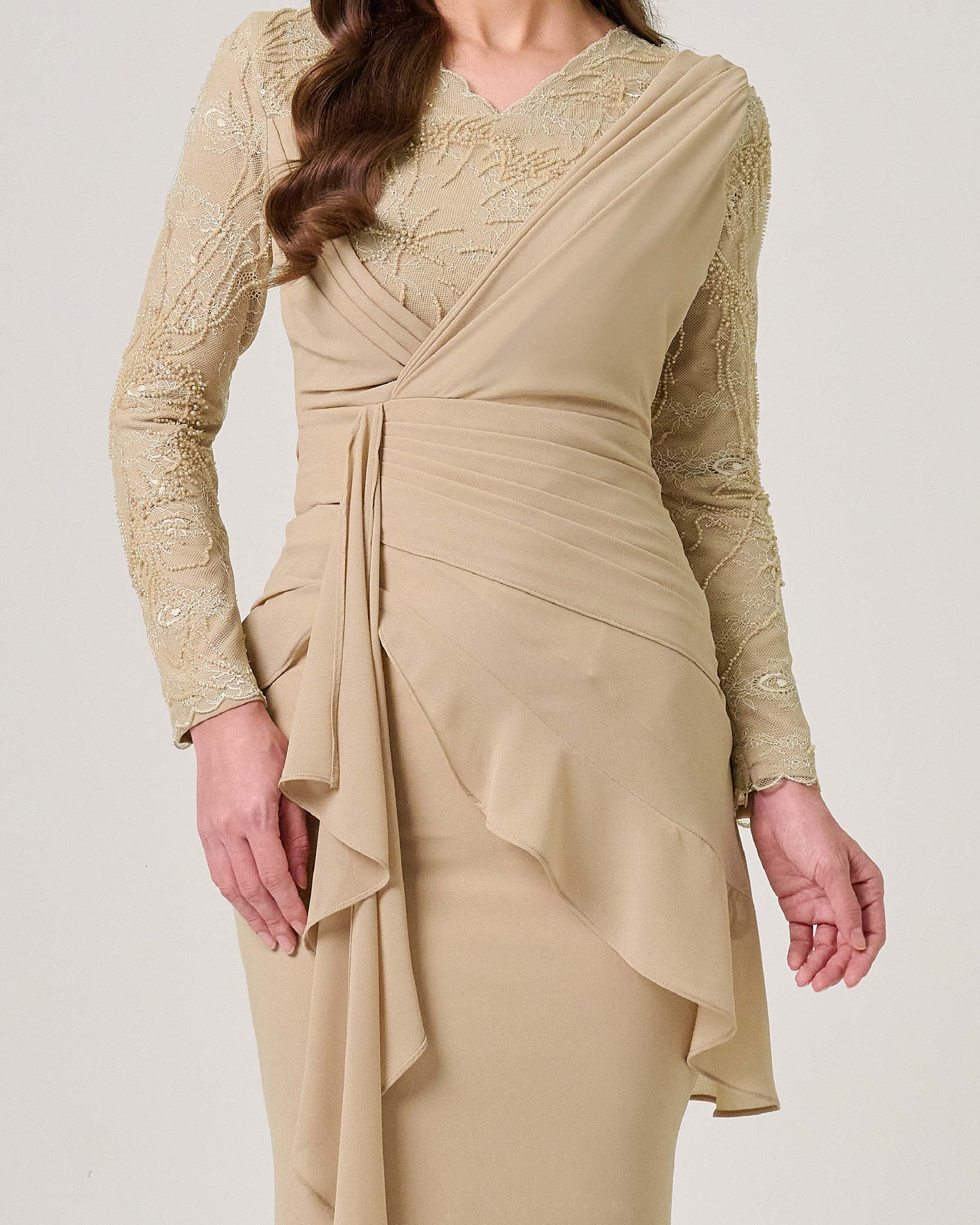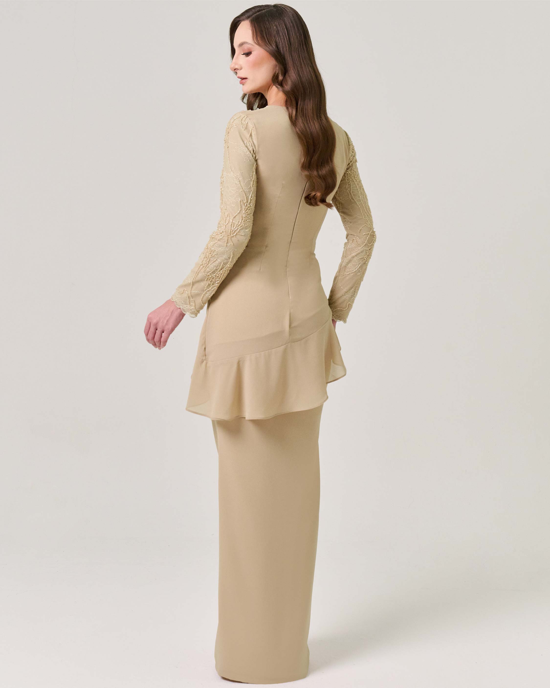 This design features lace with delicately placed bead embellishments. Please note that beading is applied selectively, and not all areas of the lace are fully beaded