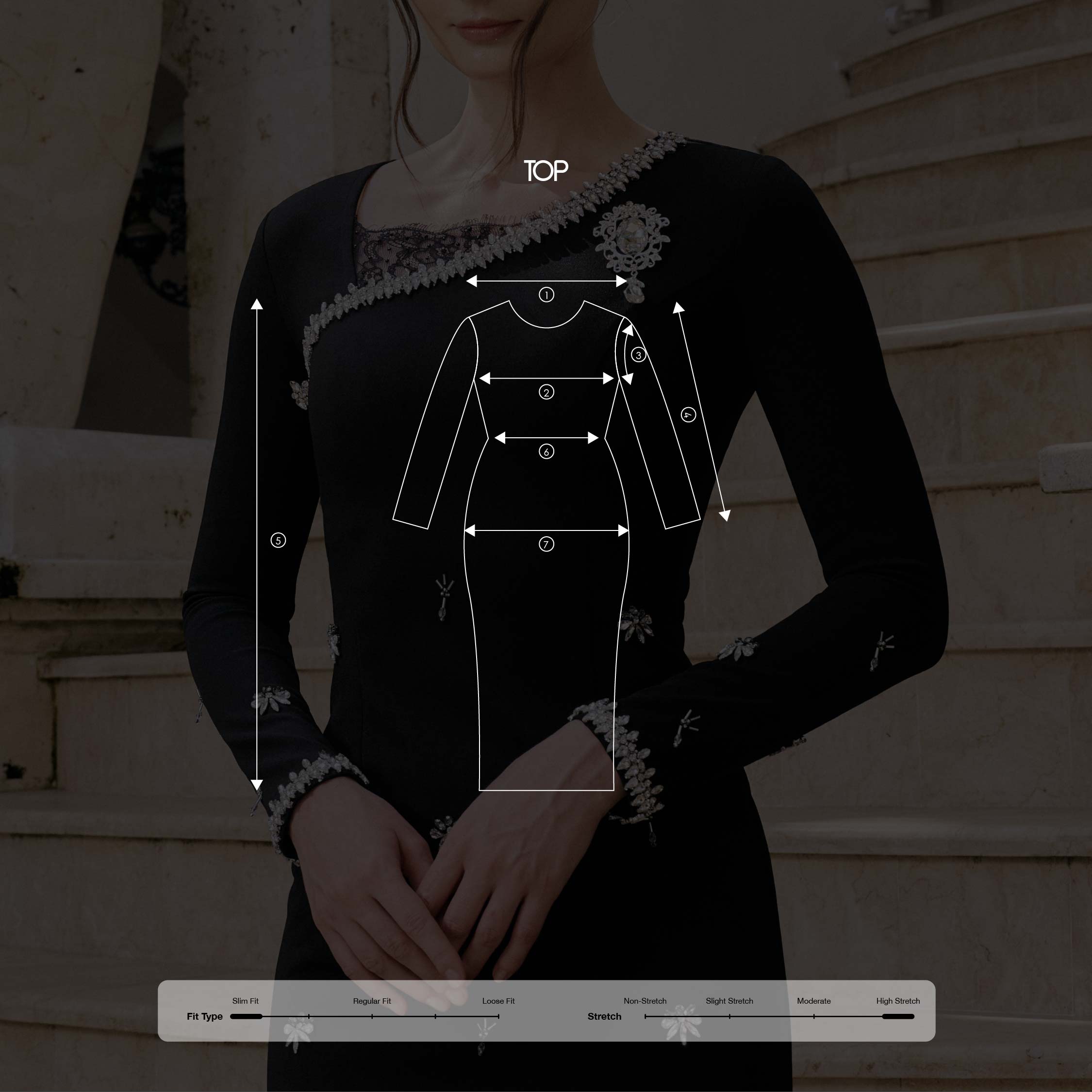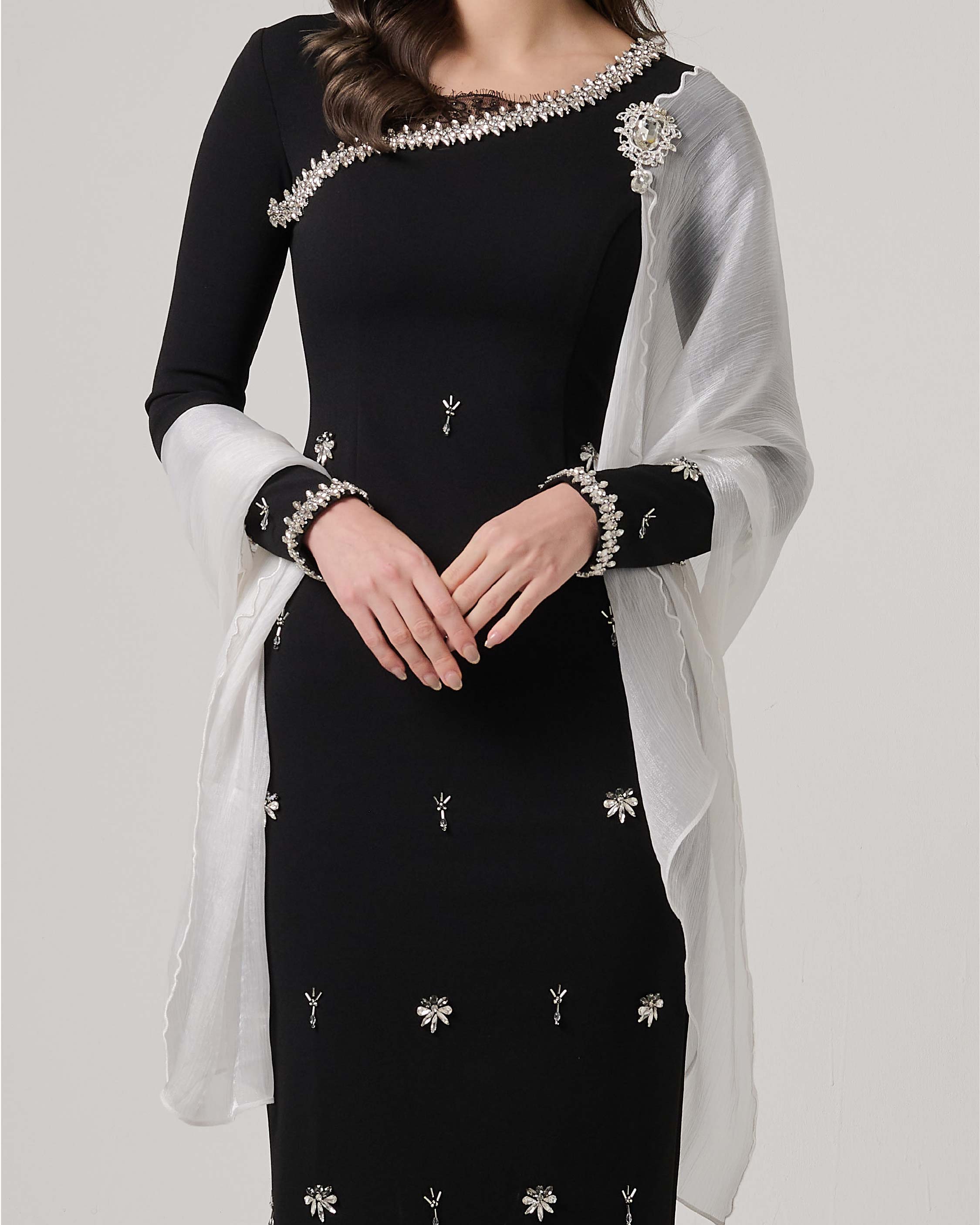 - Fitted sleeves with subtle diamond bead embellishment