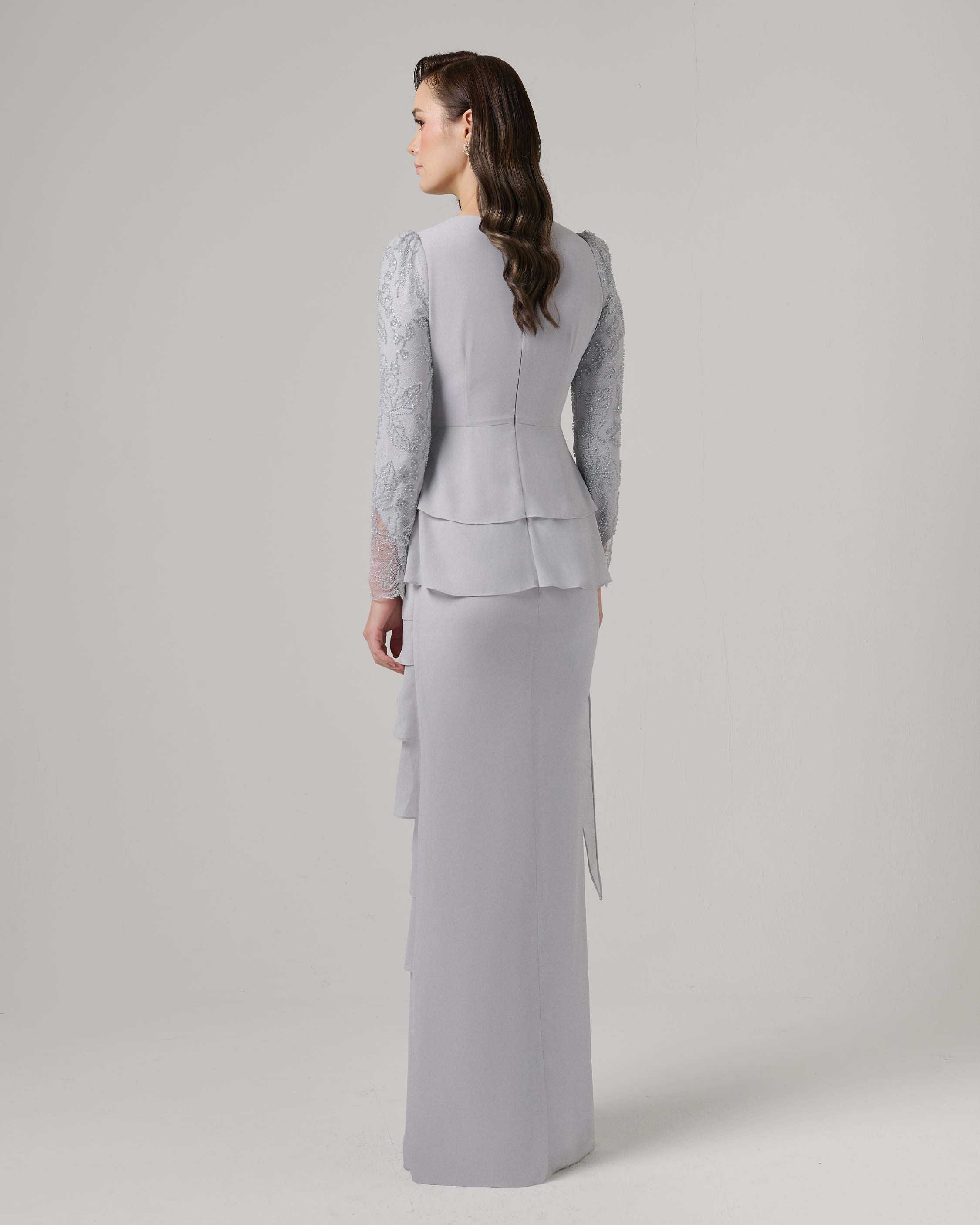 - Fitted puff sleeves with subtle french beaded embellishment