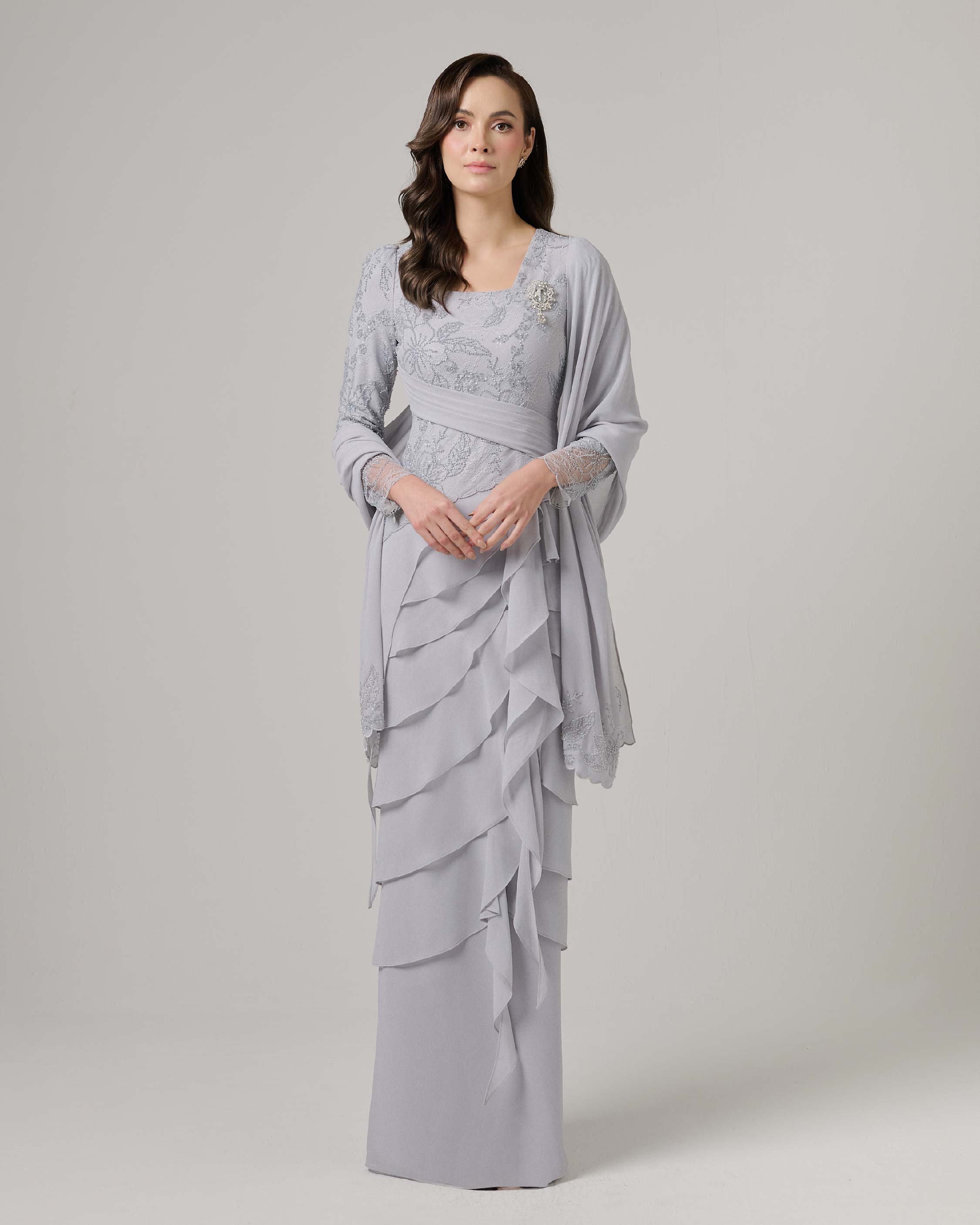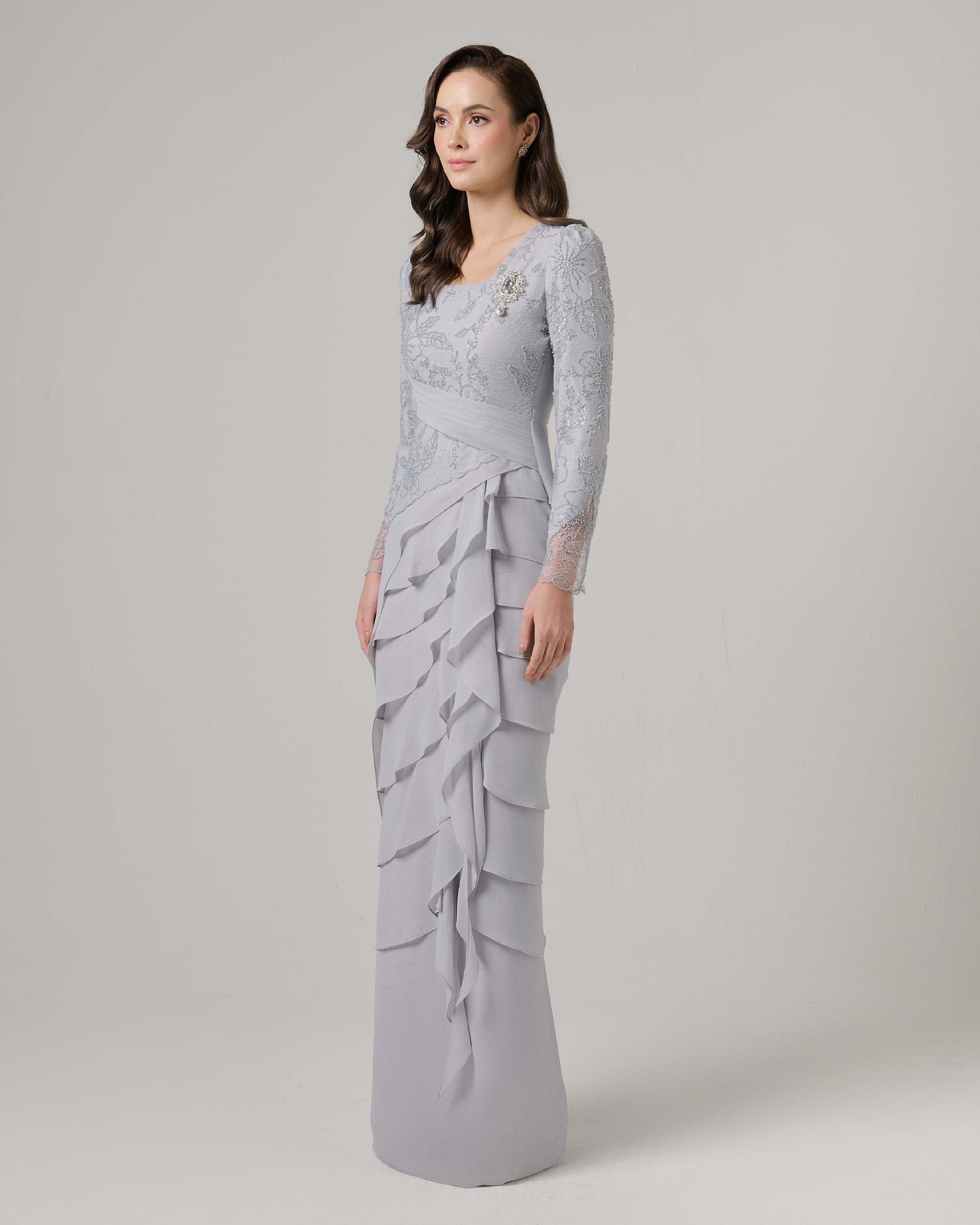 - Square neckline with exclusive french beaded lace